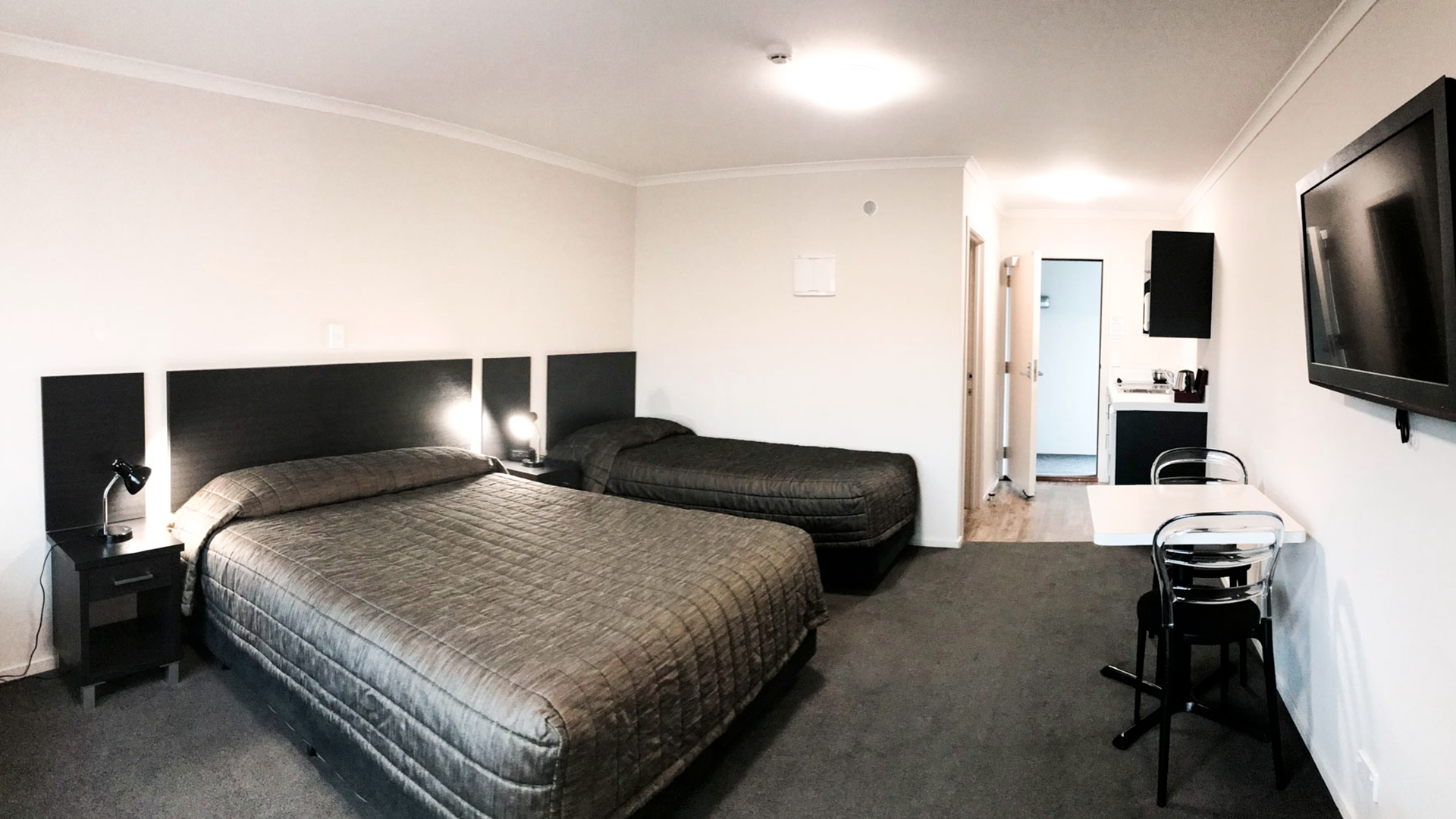 Luxury internal studio with twin share capability. King-size and a single bed with premier bedding, kitchen facilities with cooktop, SKY and Freeview channels on a 42″ LCD TV, wireless capabilities and leather lounge suite. Designed with guest comfort in mind, this stylish quiet rear unit offers double glazing and sound proofing.